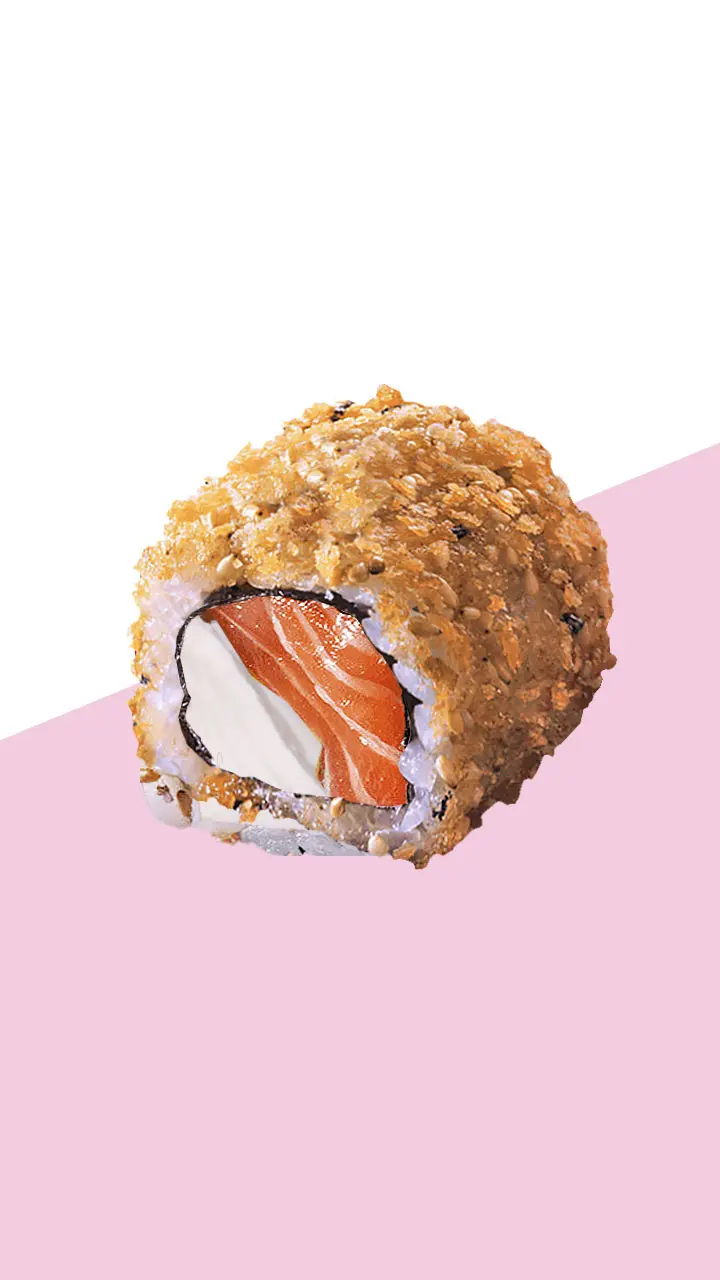 Fried California roll, salmon, cream cheese, cive, rice, nori, panko
